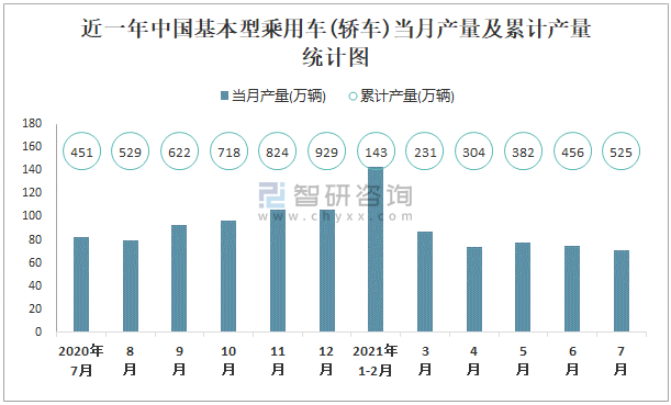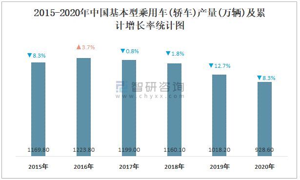 根據國家統計局數據顯示:2021年7月中國基本型乘用車(轎車)產量為70.6萬輛,同比下降14.5%;2021年1-7月中國基本型乘用車(轎車)累計產量為524.6萬輛,累計增長17.5%;2015-2020年中國基本型乘用車(轎車)產量2016年達到最高,此后逐年遞減。