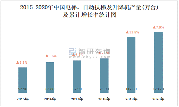 2015-2020年中國電梯、自動扶梯及升降機產量及增長率統計圖