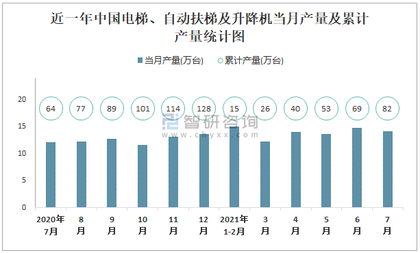 根據國家統計局數據顯示:2021年7月中國電梯、自動扶梯及升降機產量為14.1萬臺,同比增長15.6%;2021年1-7月中國電梯、自動扶梯及升降機累計產量為82.3萬臺,累計增長27%;2015-2020年中國電梯、自動扶梯及升降機產量逐年遞增,2020年達到最高。