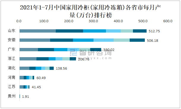2021年1-7月中國家用冷柜(家用冷凍箱)各省市每月產量排行榜