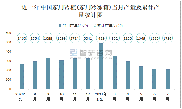 根據國家統計局數據顯示:2021年7月中國家用冷柜(家用冷凍箱)產量為212萬臺,同比下降19.1%;2021年1-7月中國家用冷柜(家用冷凍箱)累計產量為1798.1萬臺,累計增長30.7%;2015-2020年中國家用冷柜(家用冷凍箱)產量2018年跌至最低,此后逐年遞增。