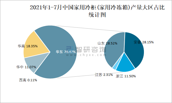 2021年1-7月中國家用冷柜(家用冷凍箱)產量大區占比統計圖