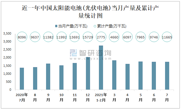 近一年中國太陽能電池(光伏電池)當月產量及累計產量統計圖