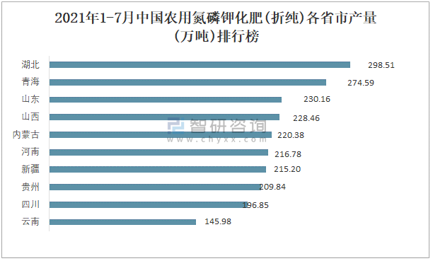 根據國家統計局數據顯示:2021年各季度(第三季度暫只統計7月數據)中國農用氮磷鉀化肥(折純)主要集中在西南、西北、華東地區生產;2021年1-7月中國農用氮磷鉀化肥(折純)產量大區分布不均衡,其中西南地區產量最高,特別是貴州省貢獻了最多產量;2021年1-7月中國農用氮磷鉀化肥(折純)各省市產量呈現梯隊式分布,湖北、青海、山東等省產量最多。