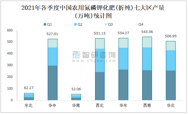 2021年各季度中國農用氮磷鉀化肥(折純)七大區產量統計圖