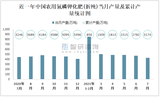 根據國家統計局數據顯示:2021年7月中國農用氮磷鉀化肥(折純)產量為433萬噸,同比下降4.8%;2021年1-7月中國農用氮磷鉀化肥(折純)累計產量為3174.4萬噸,累計下降2.6%;2015-2020年中國農用氮磷鉀化肥(折純)產量2015年達到最高,此后總體呈現下降趨勢。