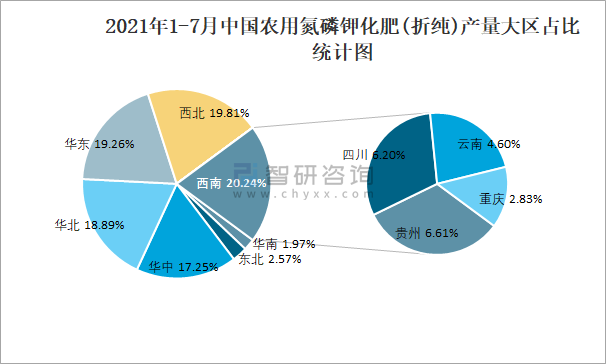 2021年1-7月中國農用氮磷鉀化肥(折純)產量大區占比統計圖