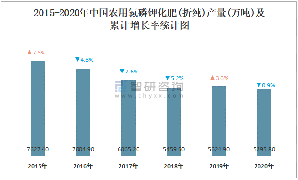2015-2020年中國農用氮磷鉀化肥(折純)產量及增長率統計圖