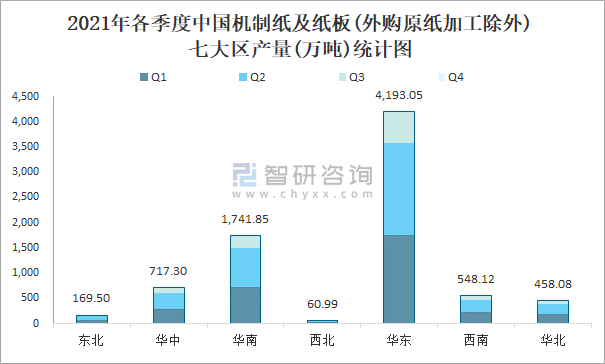 2021年各季度中國機制紙及紙板(外購原紙加工除外)七大區產量統計圖