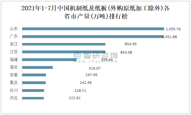 2021年1-7月中國機制紙及紙板(外購原紙加工除外)各省市產量排行榜