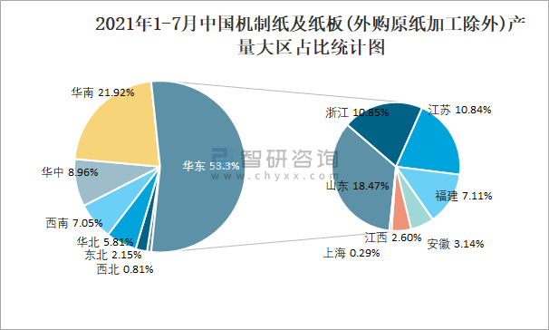 2021年1-7月中國機制紙及紙板(外購原紙加工除外)產量大區占比統計圖