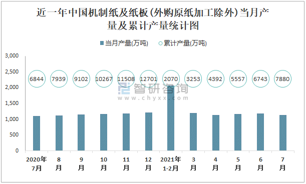 近一年中國機制紙及紙板(外購原紙加工除外)當月產量及累計產量統計圖