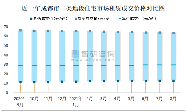 近一年成都市二類(lèi)地段住宅市場(chǎng)租賃成交價(jià)格對(duì)比圖