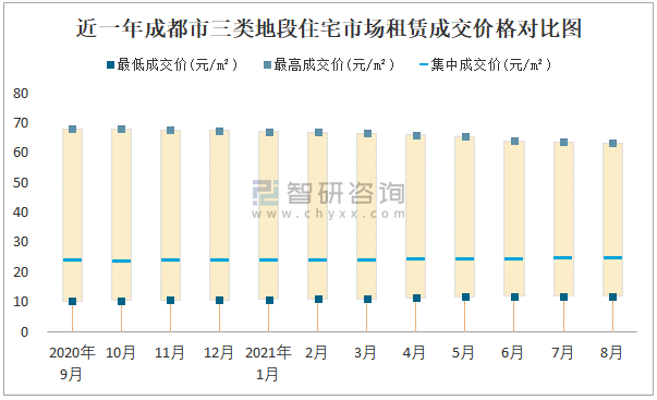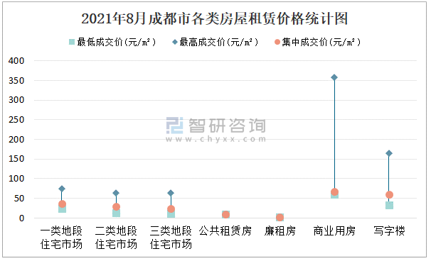 根據(jù)國(guó)信房地產(chǎn)信息網(wǎng)數(shù)據(jù)可知:2021年8月成都市7類(lèi)房屋中,公共租賃房租賃集中成交價(jià)為9.94元/m²,廉租房租賃集中成交價(jià)為1.57元/m²;商業(yè)用房租賃最低成交價(jià)、最高成交價(jià)、集中成交價(jià)均高于其他類(lèi)房屋價(jià)格;三類(lèi)地段住宅市場(chǎng)租賃集中成交價(jià)約為24.53元/m²,商業(yè)用房租賃集中成交價(jià)高于寫(xiě)字樓租賃集中成交價(jià)。