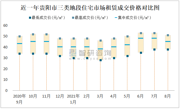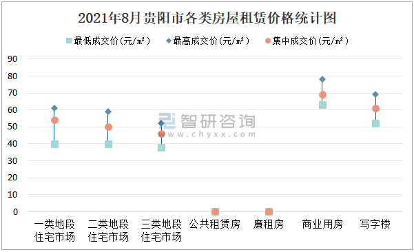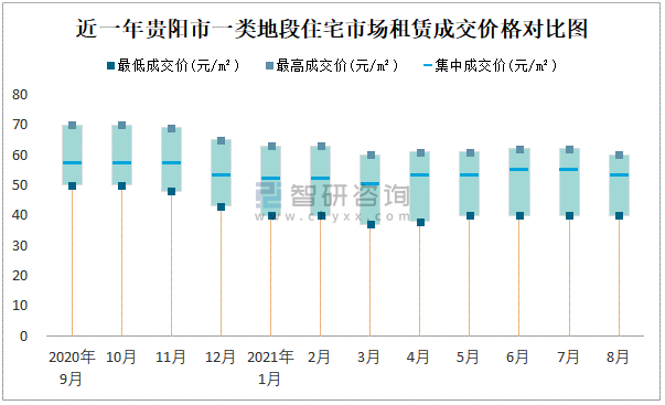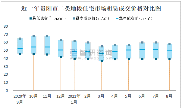 2021年8月貴陽市房屋租賃市場價格走勢:一類地段住宅市場租賃價格在40元/㎡-61元/㎡之間,集中成交價約為54元/㎡