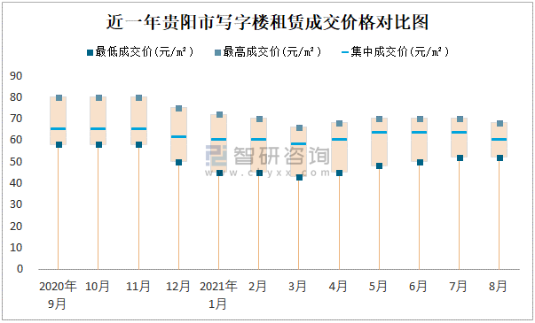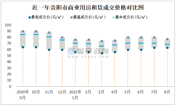 根據國信房地產信息網數據可知:近一年貴陽市商業用房租賃集中成交價在65元/m²-84元/m²之間波動,8月集中成交價為68元/m²;寫字樓租賃集中成交價2020年9月達到最高值(65元/m²)。