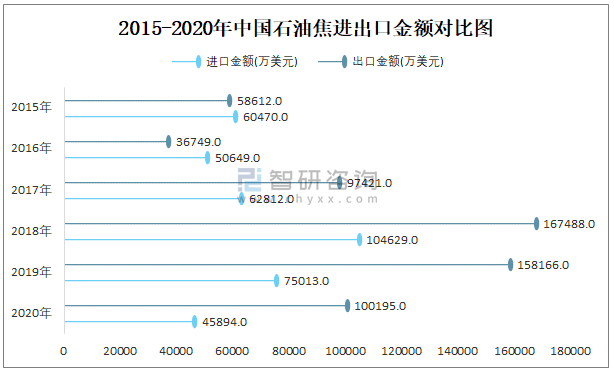2015-2020年中國石油焦進出口金額對比統(tǒng)計圖