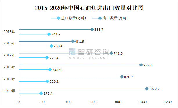 2015-2020年中國石油焦進出口數(shù)量對比統(tǒng)計圖