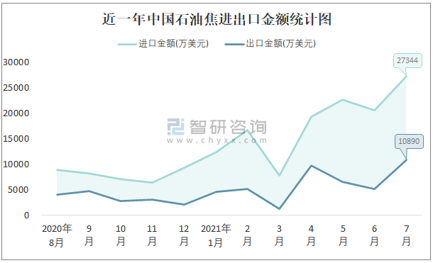 近一年中國石油焦進出口金額統(tǒng)計圖