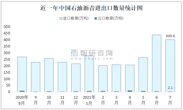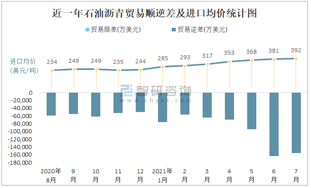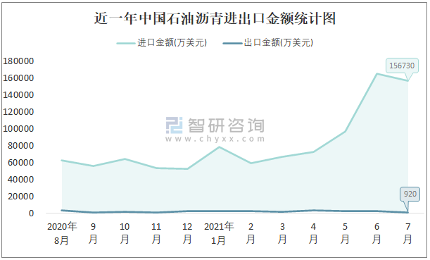 根據(jù)中國石油和化學(xué)工業(yè)聯(lián)合會數(shù)據(jù)顯示:2021年7月中國石油瀝青進(jìn)口數(shù)量為399.6萬噸,出口數(shù)量為2.1萬噸;進(jìn)口金額為156730萬美元,出口金額為920萬美元;近一年中國石油瀝青出口總金額小于進(jìn)口總金額,貿(mào)易逆差為主,7月進(jìn)口均價392.2美元/噸。