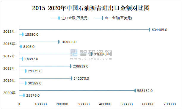 2015-2020年中國石油瀝青進(jìn)出口金額對比統(tǒng)計圖