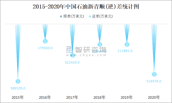 2015-2020年中國石油瀝青順(逆)差統(tǒng)計圖