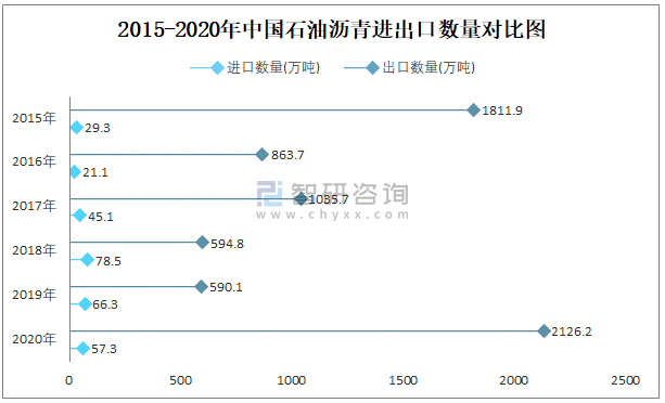 2015-2020年中國石油瀝青進(jìn)出口數(shù)量對比統(tǒng)計圖