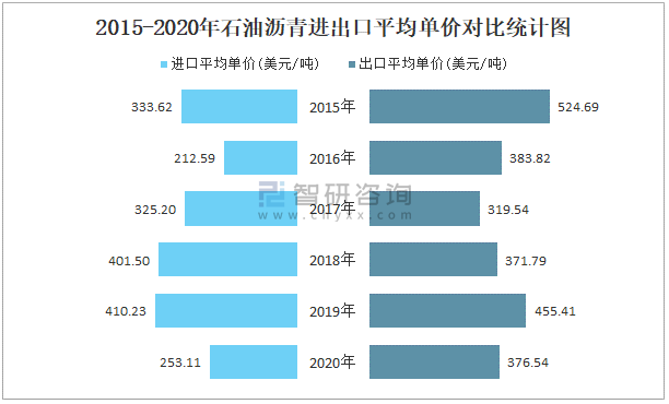 2015-2020年石油瀝青進(jìn)出口平均單價對比統(tǒng)計圖