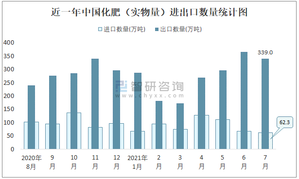 2021年7月中國化肥(實物量)進出口數(shù)量分別為62.3萬噸和339萬噸