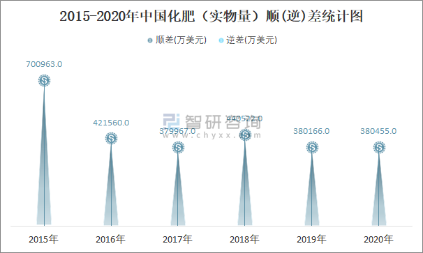 2015-2020年中國化肥(實物量)順(逆)差統(tǒng)計圖