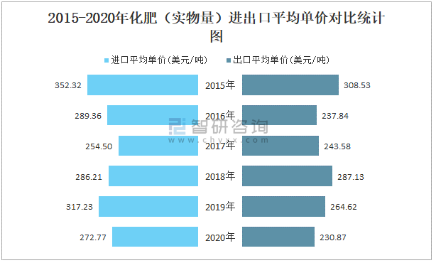 2015-2020年化肥(實物量)進出口平均單價對比統(tǒng)計圖