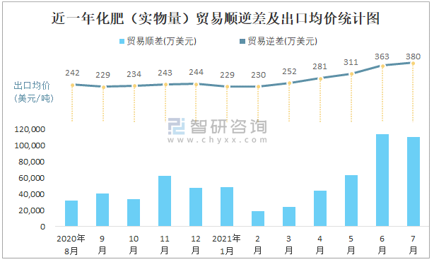 近一年化肥(實物量)貿(mào)易順逆差及出口均價統(tǒng)計圖
