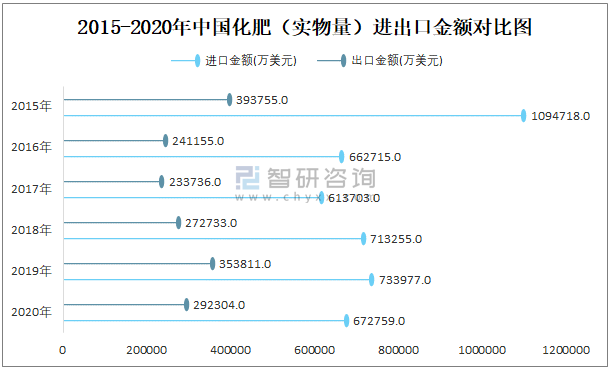 2015-2020年中國化肥(實物量)進出口金額對比統(tǒng)計圖