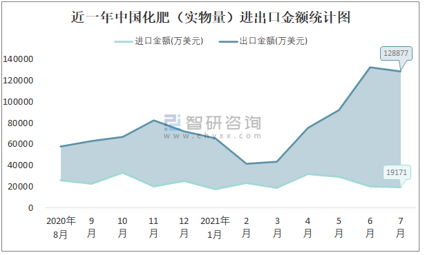 根據(jù)中國石油和化學工業(yè)聯(lián)合會數(shù)據(jù)顯示:2021年7月中國化肥(實物量)進口數(shù)量為62.3萬噸,出口數(shù)量為339萬噸;進口金額為19171萬美元,出口金額為128877萬美元;近一年中國化肥(實物量)出口總金額大于進口總金額,貿(mào)易順差為主,7月出口均價380.2美元/噸。
