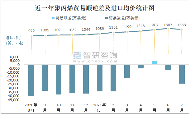 根據中國海關數據顯示:2021年7月中國聚丙烯進口數量為27.4萬噸,出口數量為7.9萬噸;進口金額為36516萬美元,出口金額為12061萬美元;近一年中國聚丙烯出口總金額小于進口總金額,貿易逆差為主,7月進口均價1332.7美元/噸。