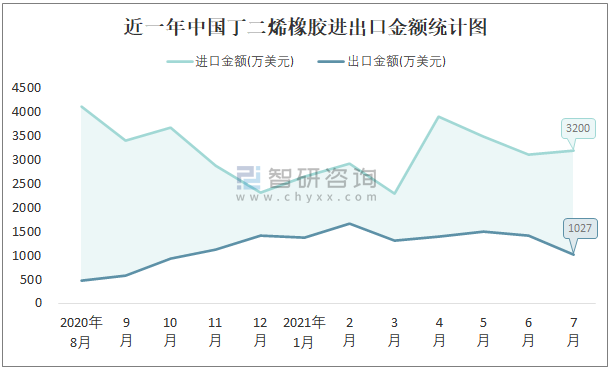 根據中國石油和化學工業聯合會數據顯示:2021年7月中國丁二烯橡膠進口數量為1.5萬噸,出口數量為0.6萬噸;進口金額為3200萬美元,出口金額為1027萬美元;近一年中國丁二烯橡膠出口總金額小于進口總金額,貿易逆差為主,7月進口均價2133.3美元/噸。
