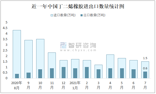 2021年7月中國丁二烯橡膠進出口數量分別為1.5萬噸和0.6萬噸
