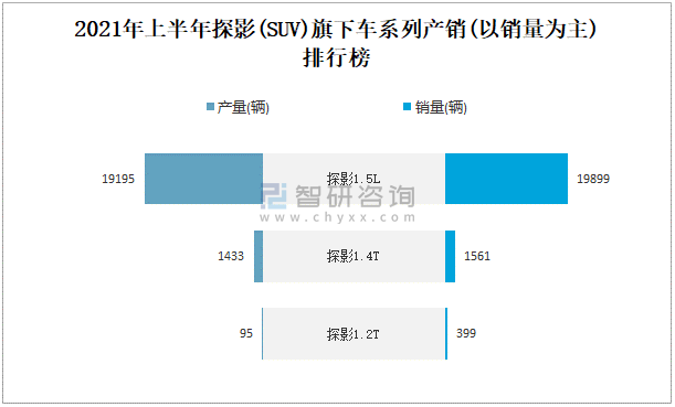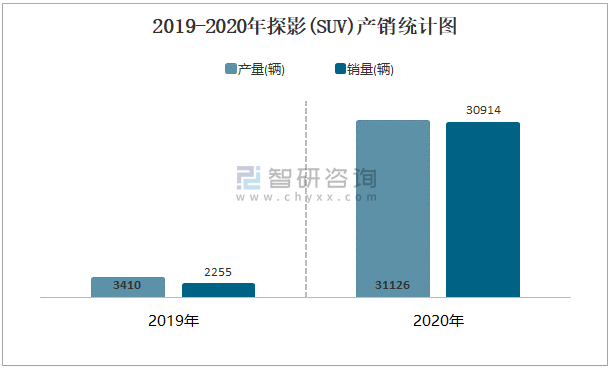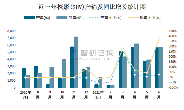 根據中國汽車工業協會數據可知:2021年6月探影(SUV)產量為5613輛,同比增長27.6%,銷量為5710輛,同比增長379.4%,當月產銷率為101.73%;2021年上半年探影(SUV)產量為20723輛,同比增長34.8%,銷量為21859輛,同比增長112.6%,產銷率為105.48%;2019-2020年探影(SUV)產銷量大幅度增加,且近2年總產量大于總銷量,積壓了庫存1367輛。