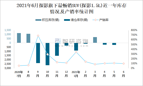 2021年6月探影旗下最暢銷SUV(探影1.5L)近一年庫存情況及產銷率統計圖