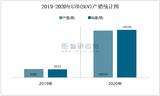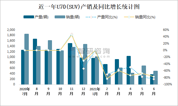 根據中國汽車工業協會數據可知:2021年6月U70(SUV)產量為358輛,同比下降83.6%,銷量為488輛,同比下降77.1%,當月產銷率為136.31%;2021年上半年U70(SUV)產量為3939輛,同比下降61.2%,銷量為3199輛,同比下降66.1%,產銷率為81.21%;2019-2020年U70(SUV)產銷量總體呈現上升趨勢,且近2年總銷量大于總產量,清倉庫存240輛。