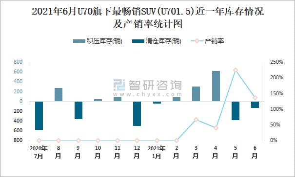 2021年6月U70旗下最暢銷SUV(U701.5)近一年庫存情況及產銷率統計圖