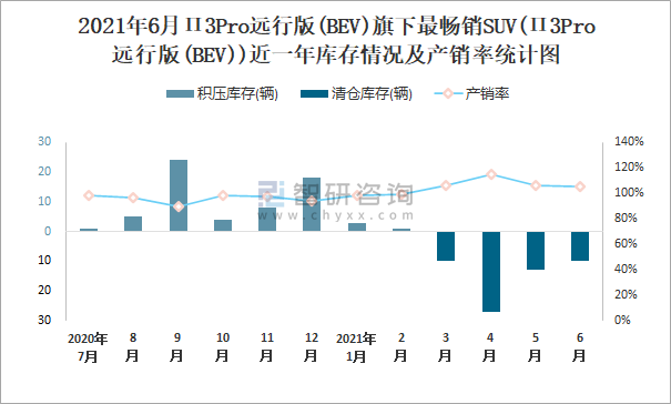2021年6月П3PRO遠(yuǎn)行版(BEV)旗下最暢銷SUV(П3Pro遠(yuǎn)行版(BEV))近一年庫存情況及產(chǎn)銷率統(tǒng)計圖