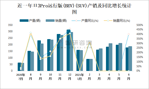 根據(jù)中國汽車工業(yè)協(xié)會數(shù)據(jù)可知:2021年6月П3Pro遠(yuǎn)行版(BEV)(SUV)產(chǎn)量為176輛,同比增長402.9%,銷量為186輛,同比下降0%,當(dāng)月產(chǎn)銷率為105.68%;2021年上半年П3Pro遠(yuǎn)行版(BEV)(SUV)產(chǎn)量為965輛,同比下降0%,銷量為1021輛,同比下降0%,產(chǎn)銷率為105.8%;2019-2020年П3Pro遠(yuǎn)行版(BEV)(SUV)產(chǎn)銷量大幅度上升,且近2年總產(chǎn)量大于總銷量,積壓了庫存77輛。