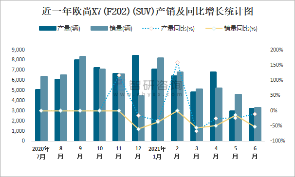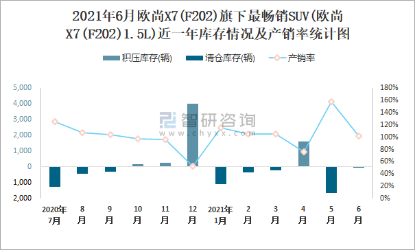 根據中國汽車工業協會數據可知:2021年6月歐尚X7(F202)(SUV)產量為3202輛,同比下降10.5%,銷量為3306輛,同比下降52.8%,當月產銷率為103.25%;2021年上半年歐尚X7(F202)(SUV)產量為31314輛,同比下降28.9%,銷量為33182輛,同比下降30%,產銷率為105.97%;且2020年歐尚X7(F202)(SUV)總銷量大于總產量,清倉庫存1503輛。