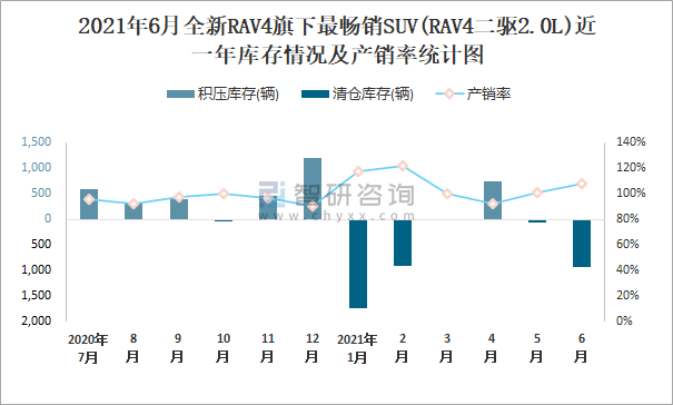 2021年6月全新RAV4旗下最暢銷SUV(RAV4二驅2.0L)近一年庫存情況及產銷率統計圖