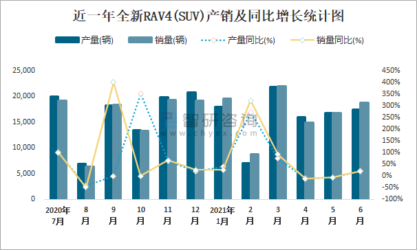 近一年全新RAV4(SUV)產銷及同比增長統計圖