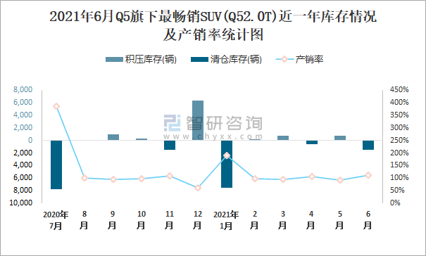 2021年6月Q5旗下最暢銷SUV(Q52.0T)近一年庫存情況及產(chǎn)銷率統(tǒng)計圖