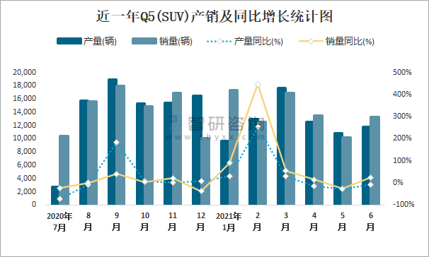 近一年Q5(SUV)產(chǎn)銷及同比增長統(tǒng)計圖