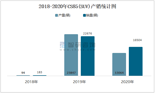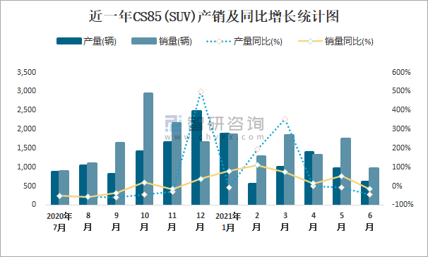 根據中國汽車工業協會數據可知:2021年6月CS85(SUV)產量為606輛,同比下降43.2%,銷量為965輛,同比下降15.1%,當月產銷率為159.24%;2021年上半年CS85(SUV)產量為6399輛,同比增長33.6%,銷量為9016輛,同比增長46.5%,產銷率為140.9%;2018-2020年CS85(SUV)產銷量均在2019年達到最高值,此后有所下滑,且近3年總銷量大于總產量,清倉庫存2358輛。
