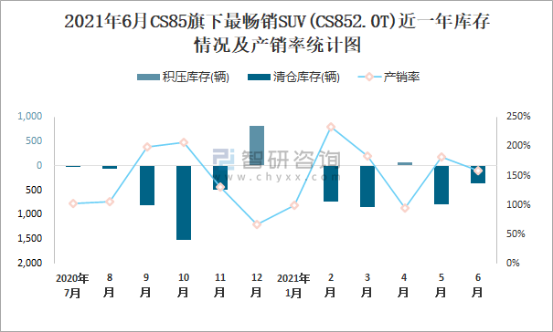2021年6月CS85旗下最暢銷SUV(CS852.0T)近一年庫存情況及產銷率統計圖